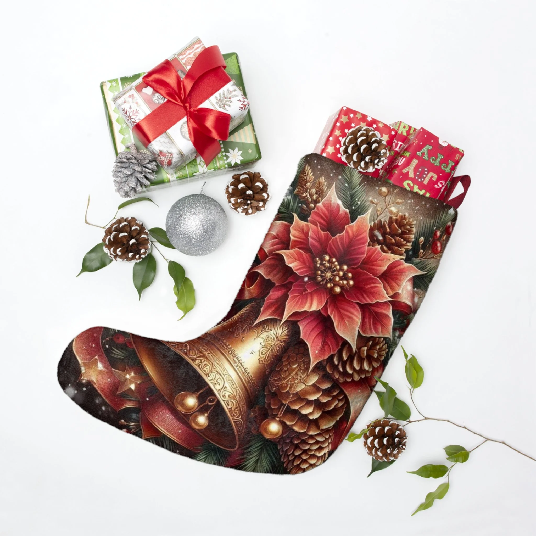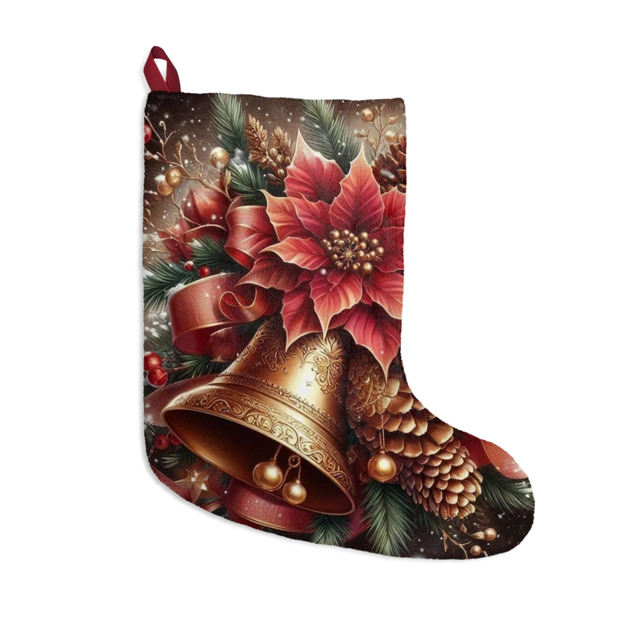 Bring warmth and joy to your holiday season with this exquisitely crafted Christmas Stocking. Featuring a gorgeous design adorned with festive bell and poinsettia motifs, it radiates a cheerful vibe that will elevate your holiday decorations. Perfect for hanging by the fireplace, this stocking is not only spacious enough to hold a bounty of gifts but also adds an elegant touch to your home. Ideal for families, couples, or individuals who appreciate holiday flair, this stocking is a must-have for Christmas celebrations, family gatherings, and festive occasions. Make your holidays memorable with this delightful addition that embodies the spirit of giving and togetherness!